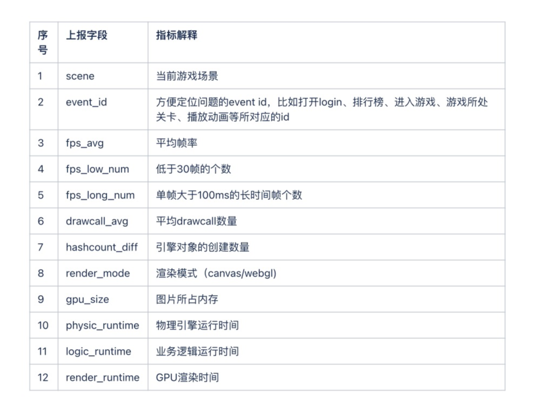 通过分析上报的游戏性能数据,我们能更好地分析性能瓶颈,从而有侧重性地提升游戏性能。其中,涉及到的详细性能指标如下: