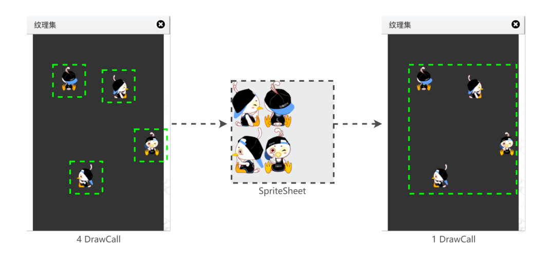 在开发过程中将散图合成一张大图的图集,达到降低 DrawCall 的目的。
