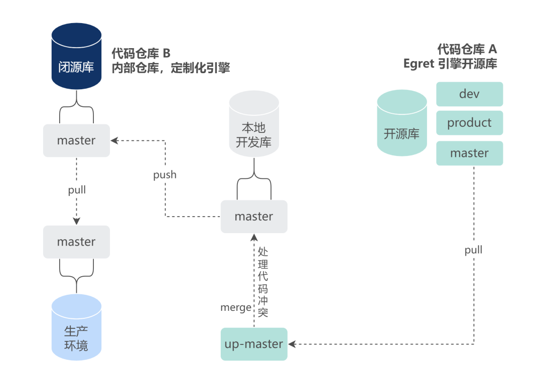 优化引擎的同时,为了和官方仓库保持同步,我们利用了 git 多 remote 仓库的特性,实现了双仓库代码合并。
