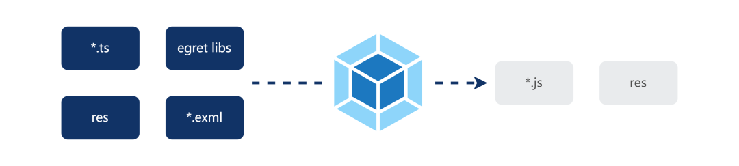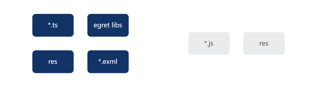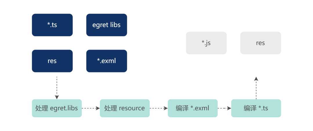 exml 文件类型是 Egret 引擎特有的文件类型,目前前端生态没有相关的解析编译工具;res 文件处理也没有必要重新造轮子,所以我们沿用官方的工具,封装到 @egret-egine/egret-core/tools