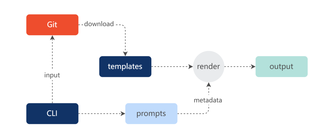 参考其他脚手架的思路,模版作为独立资源发布到远程仓库上,然后运行的时候通过 CLI 工具下载下来,经过 CLI 的交互信息,作为交互的输入元信息渲染项目模版。