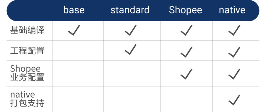 由于我们需要对应不同的需求,且业务相关的配置较多,导致模版业务配置差异比较大,暂不能完全做到一个统一的模版。同时,为了保证一个模版内没有冗余的配置,我们做了区分,主要提供了 base、standard、Shopee、native 四种项目模版。