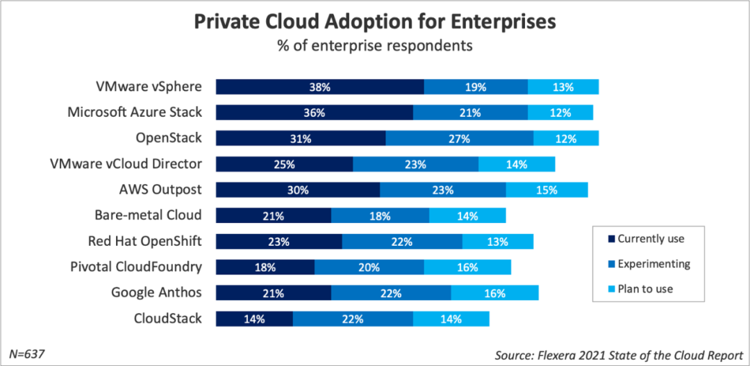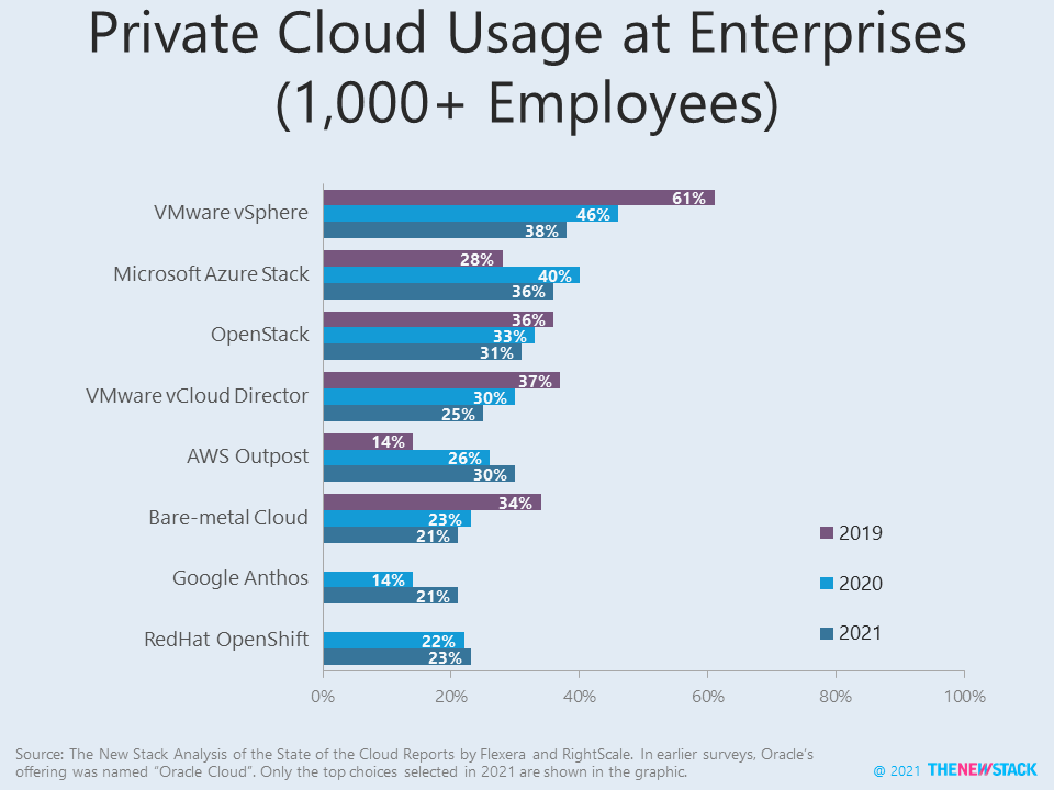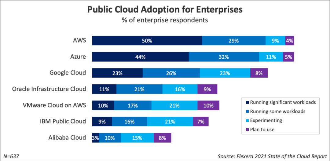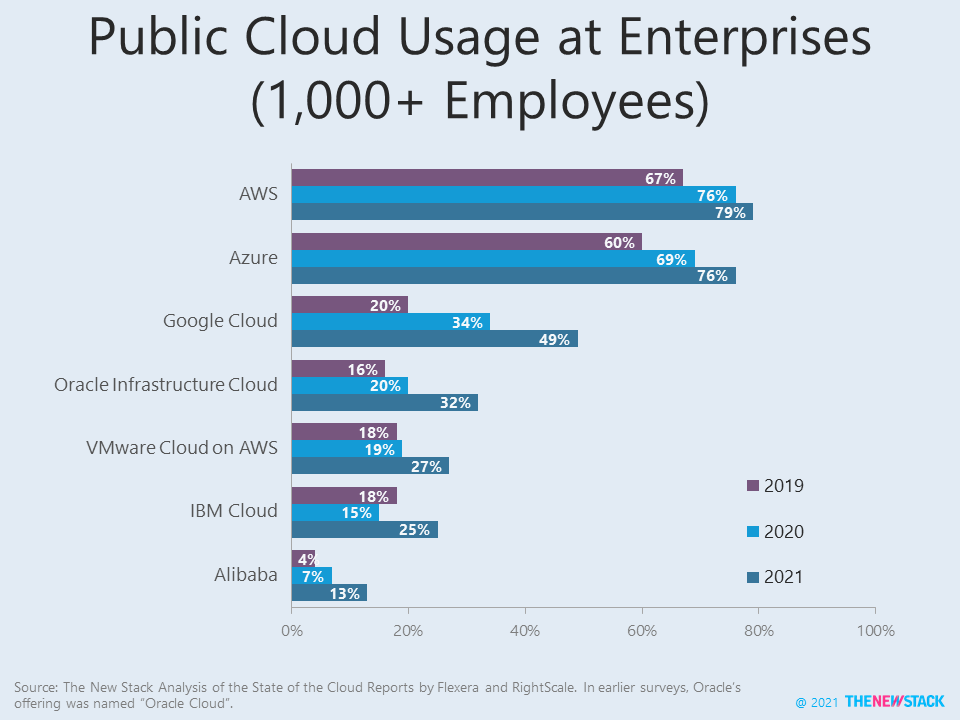 对谷歌云和甲骨文云来说,这些数字太好了。在Flexera的《2021云现状报告》调查中,49%的企业受访者使用谷歌云平台,高于2019年调查中的20%。甲骨文基础设施云也从16%飙升至32%。当然,AWS和Microsoft Azure仍然是公共云的老大和老二。