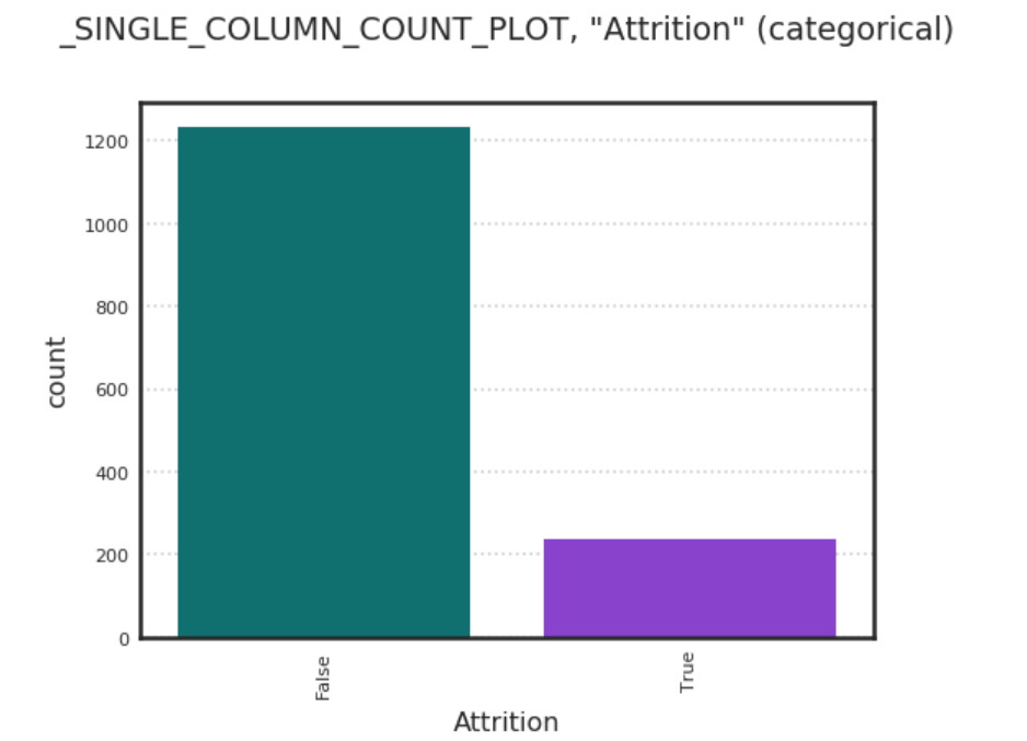 数据可视化是现代数据科学实践中数据探索和数据分析的重要组成部分。ADS提供了一个智能的可视化工具,可以自动检测数据列的类型,并提供可视化数据的最佳方法。接下来,我们可以使用show_in_notebook(),target. show_in_notebook(),type_of_target()等功能对目标数据进行可视化和探索,发现数据集中共1470个样本,33个有效特征,目标字段Attrition分布如下图: