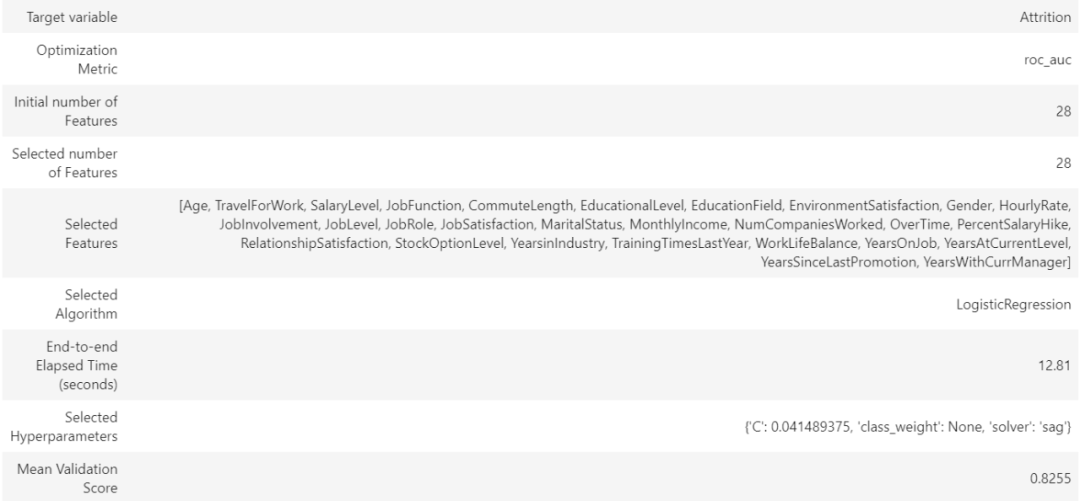 'RandomForestClassifier'], min_features=['OverTime', 'JobLevel'], score_metric = "roc_auc", time_budget=160)
