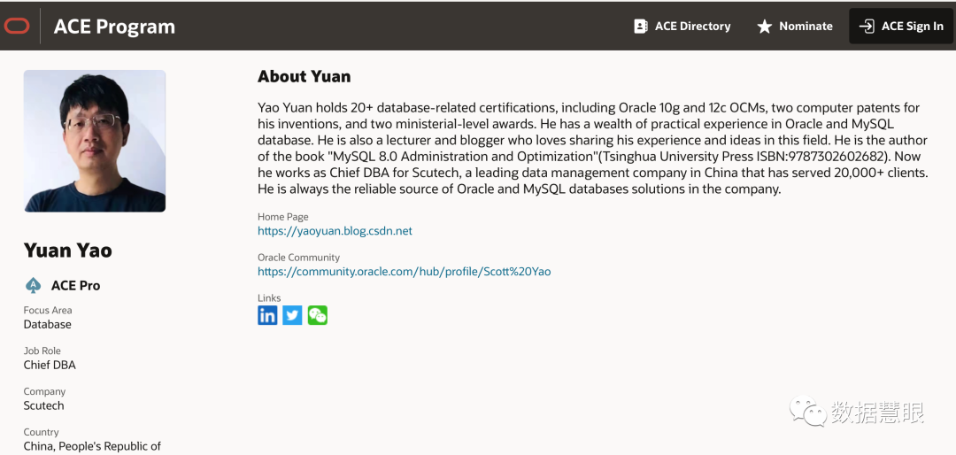 姚远:Oracle ACE(Oracle和MySQL数据库方向 https://apexapps.oracle.com/pls/apex/r/ace_program/oracle-aces/ace?ace_id=1135),华为云MVP。拥有包括 Oracle 10g和12c OCM在内的20+数据库相关认证。曾任IBM公司数据库部门经理,现在一家第三方公司任首席数据库专家,服务2万+客户,《MySQL 8.0运维与优化》的作者。