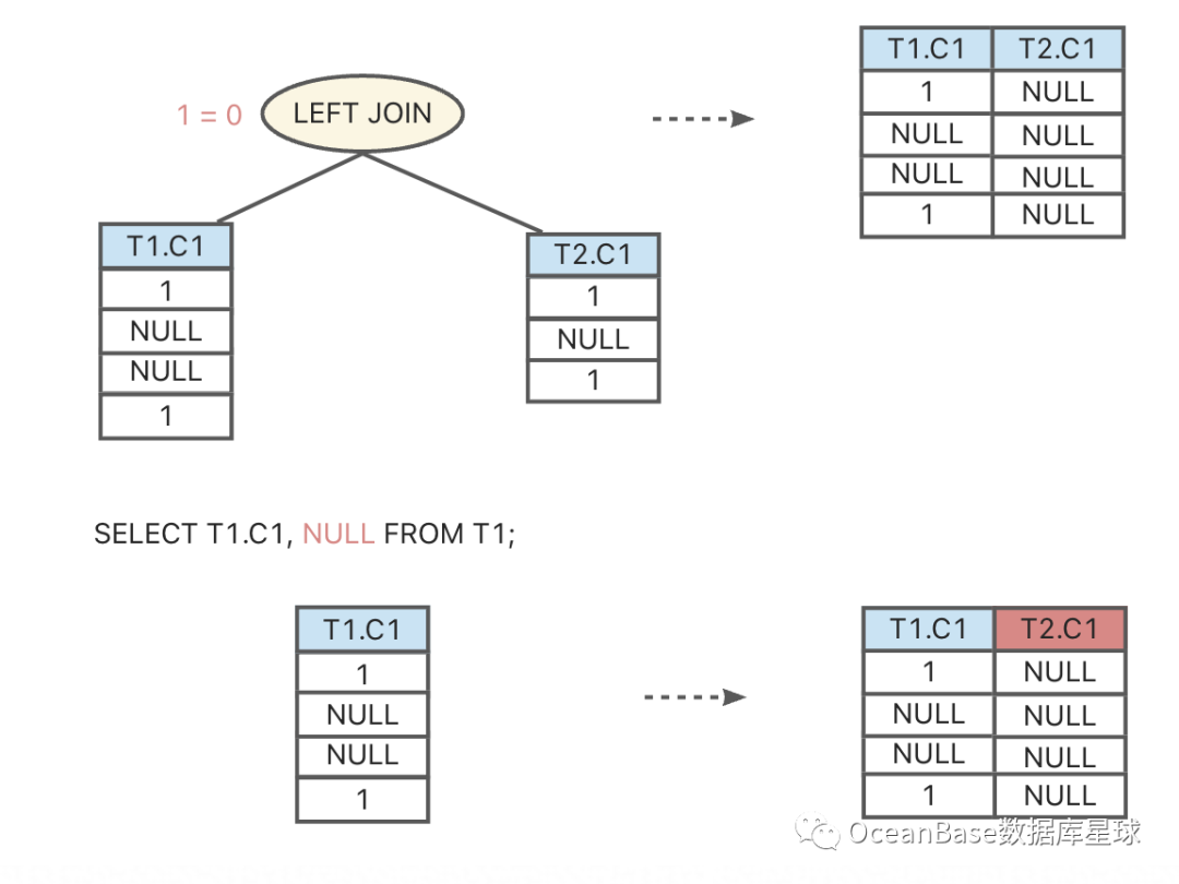 根据左外连接的定义,右表中与左表不匹配的行需补NULL,由于Q7的连接条件恒FALSE,左表T1的每一行都无法与T2中的行匹配,使得右侧表全部补为NULL,换言之,我们无需关注右侧表的返回值,只需保留右侧表返回列的列名、类型等SCHEMA信息即可,因此右侧表T2可被消除。这种在恒FALSE连接条件下消除右表的方式,被称为恒FALSE连接消除。