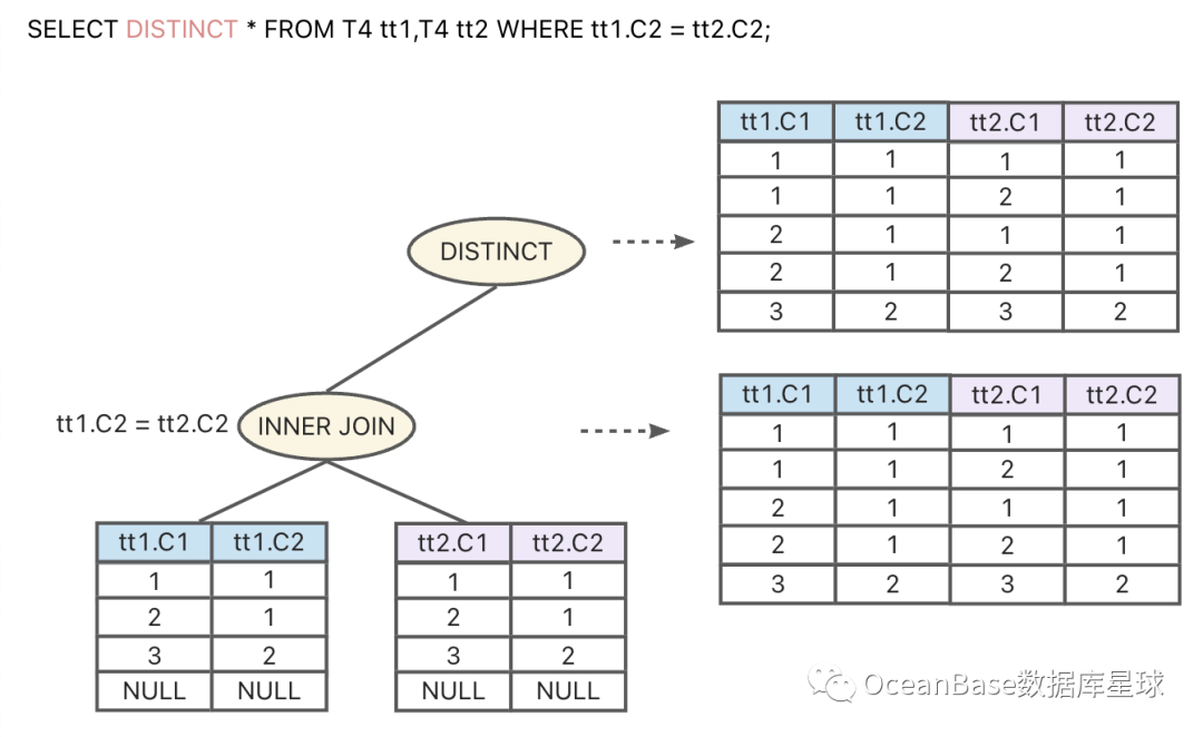在Q3中,C1列存在NULL值和重复值,和T2通过等值条件T1.C1=T2.C1进行外连接后,返回的结果集大于T1的原表行数,但是在通过DISTINCT去重后,其结果和直接对T1表的返回结果集加DISTINCT是一样的。
