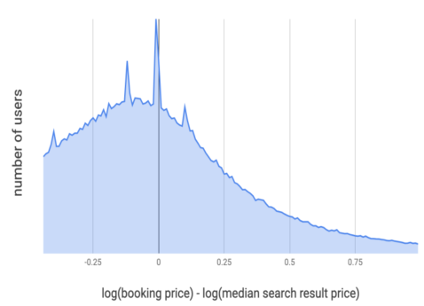 怀疑此间仍有优化的空间,于是他们分析了房源价格对用户预订决策的影响。如下图所示,X 轴是预订价格与搜索结果的价格中位数(以下简称价格中位数)的对数差,Y 轴是用户数。他们期望,用户数对价格差,状似正态分布:相对于价格中位数,用户偶尔出价更高,偶尔更低,总的来说,是一个对称的分布。但事实是,它是一个明显的偏态分布。这意味着,用户的平均出价低于价格中位数,也就是,用户偏好价格更低的房源,Cheaper Is Better。