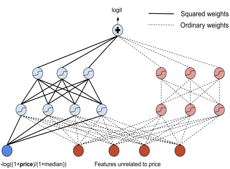 于是,左半网络保证了价格与其他特征的交互,并保持了模型输出对价格的单调递减: