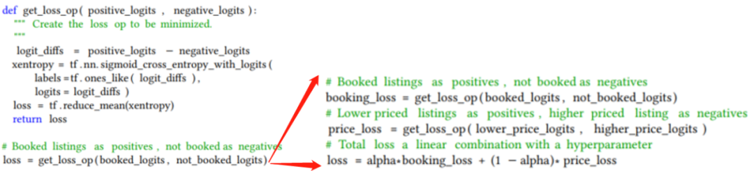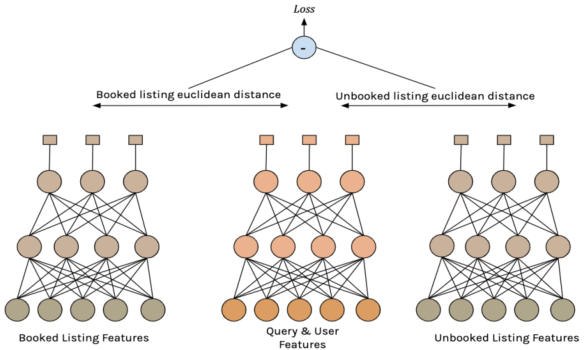 如上图所示,模型看起来像一个三塔结构。事实上,训练的样本依然是房源对:一个预订的房源和一个未预订的房源,而两个房源由同一座塔进行处理。