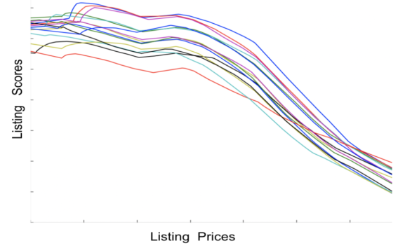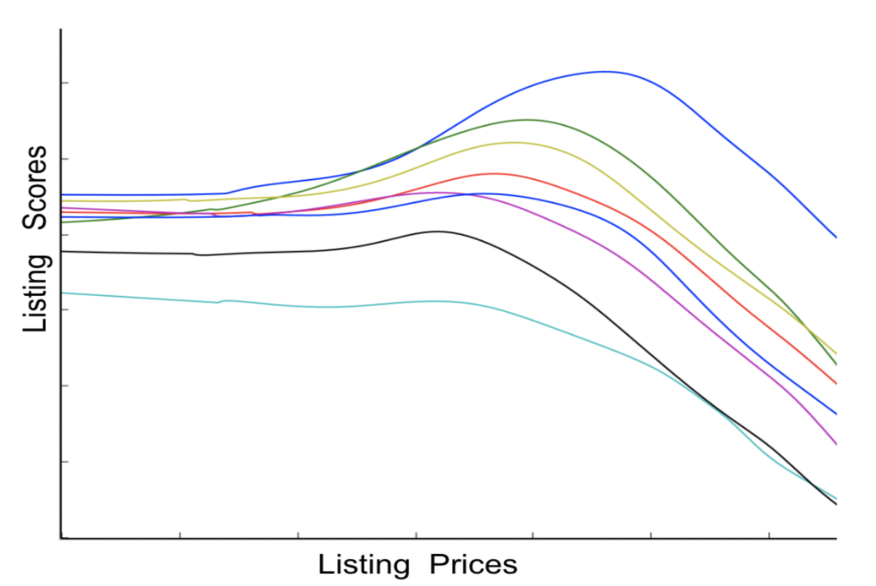 这一次,他们对问题进行了简化,并不尝试解释价格对模型的影响,而是专注于理解每一次的搜索结果。借助 Individual Conditional Expectation (ICE) 的思想,他们将每一次(基线的)搜索结果的房源拎出来,绘制了房源的排序得分-价格的关系图,如下图所示。