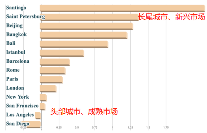 下图反映了不同城市,用户预订价格与价格中位数的差异。可以看到,价格差异在不同城市之间具有明显的分化:在代表成熟市场的头部城市,比如洛杉矶(Los Angeles)、旧金山(San Francisco),价格差异很小;在代表新兴市场的长尾城市,比如北京、Santiago(智利首都,圣地亚哥),价格差异就非常大。