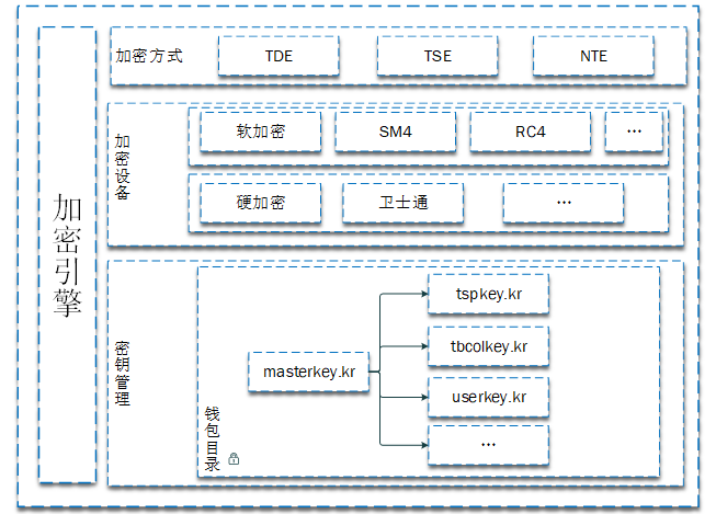 加密框架由加密方式管理,加密设备管理和密钥管理三部分组成。加密方式包括透明加密,半透明加密和非透明加密组成;加密设备管理,包括软加密设备和硬加密设备;密钥管理包括主密钥管理,对象密钥管理等。