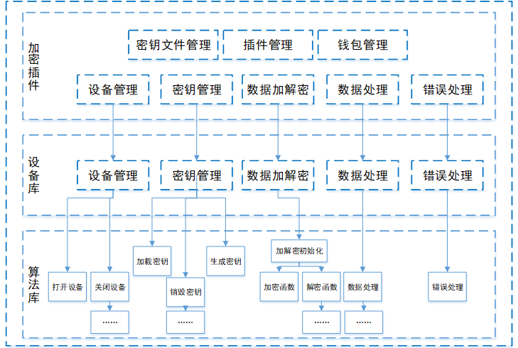 API函数主要包括五大类函数:设备管理类函数,密钥管理类函数,加解密算法类函数,数据管理类函数,错误处理类函数。设备管理类函数负责对加密设备的管理,打开加密设备、关闭加密设备等。密钥管理类函数负责密钥管理,包括生成密钥,加载密钥,销毁密钥等。加解密算法类函数负责对数据的加解密。数据管理类函数负责加密前对数据的处理操作。错误处理类函数负责对加解密运行中的错误处理。