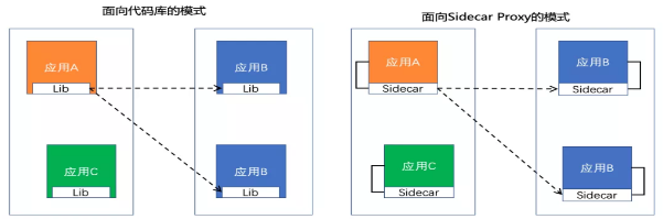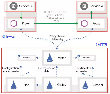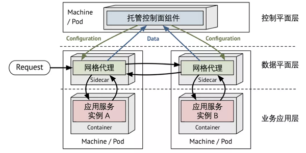 上面的核心为由Sidecar代理(后面会谈到)形成一个网状的数据平面,通过该数据平面处理和观察所有服务间的流量。数据平面扮演了一个用来建立、保护和控制通过网格的流量的角色。而对应的负责数据平面如何执行的管理组件称为控制平面。控制平面是服务网格的大脑,并为网格使用人员提供公开API,以便较容易地操纵网络行为。业务应用系统,只需要跟部署在同一机器或Pod内的SideCar代理互相访问,即可实现上面微服务环境所依赖的诸多治理服务。