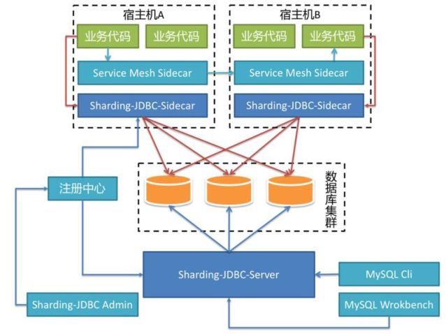 与Service Mesh类似,微服务需要治理,数据库应用同样需要。其基本治理能力所包含的数据库发现、访问路由、数据分片、读写分离、负载均衡、熔断、链路采集、可观测性等等。为达到上述能力,一般都是通过何种方式实现的?常见的有两种:Client模式和Proxy模式。前者是一种客户端模式,其优点是无中心化架构,缺点是无法支持异构语言。后者是一种能代理端模式,优点是异构语言的支持,缺点依然是中心化架构。显然上述两种模式,都存在一定的问题,进而对应的SideCar模式也就顺理成章。下图是摘自ShardingSphere对database Mesh实现的一个构想。
