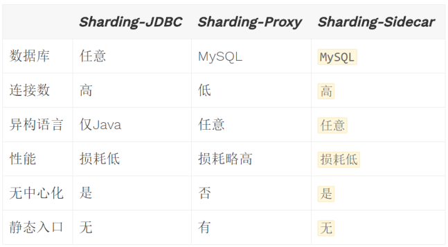 业务代码通过Service Mesh的SideCar访问Database Mesh的SideCar,进而访问数据库集群。而对于管理端,则仍可以使用Proxy模式,通过伪装数据库的方式直接通过访问。那么针对这三种模式,ShardingSphere也做了对比,由下图可见SideCar方式在多方面占优。