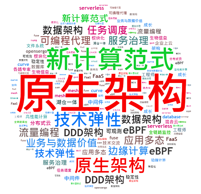 会议内容涵盖流量编程、微服务治理、Data Mesh、多态应用管理、DDD架构设计、eBPF性能加速等诸多议题,来自众多高新技术领军企业的资深技术专家,将从自己的实际案例出发,分享云原生实践路上遇到的挑战以及解决问题的思路和技巧。议题内容丰富,如以下图中关键词。