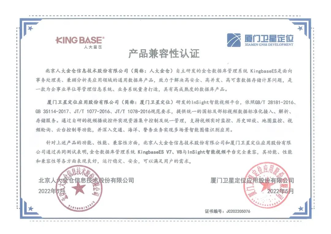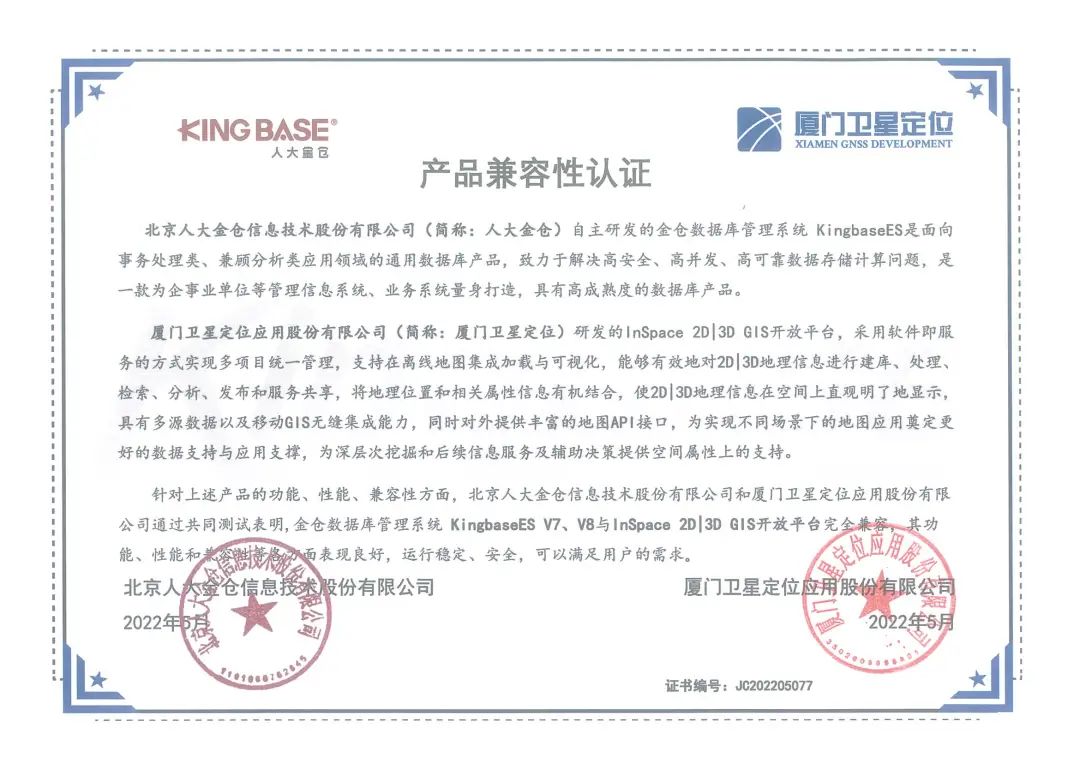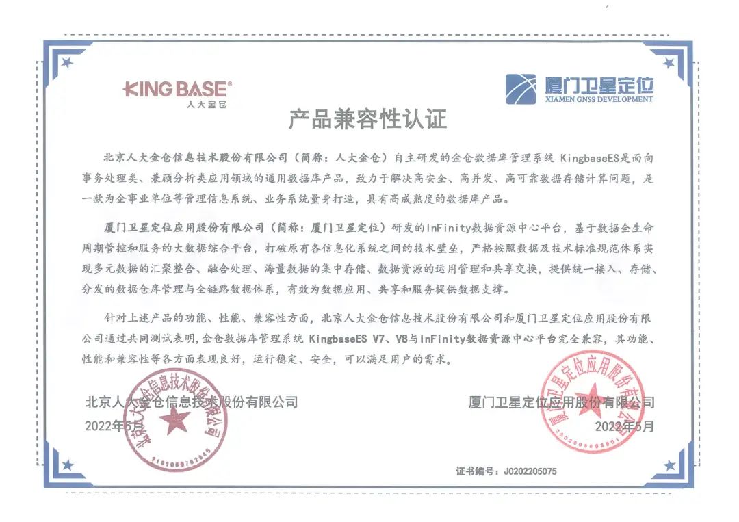 经过双方严格测试表明,双方产品在功能、性能、可靠性要求等方面完全兼容,整体运行稳定高效。通过此次兼容性测试和认证工作,人大金仓和厦门卫星定位在行业生态拓展上迈出了坚实一步,通过发挥各自产品技术优势,推动双方产品体系的生态融合,全面提高产品竞争力,提升满足客户需求的能力。