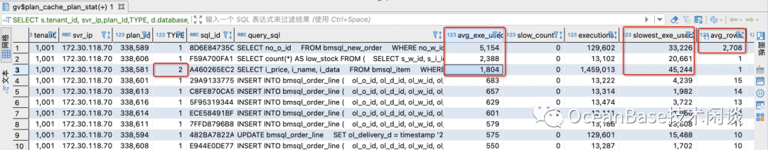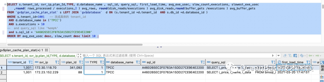 SELECT s.tenant_id, svr_ip,plan_Id,TYPE, d.database_name , sql_id, query_sql, first_load_time, avg_exe_usec, slow_count,executions, slowest_exe_usec ,round( rows_processed executions,2 ) avg_rows, round(disk_reads/executions ) avg_disk_reads,round(buffer_gets executions ) avg_buffer_getsFROM `gv$plan_cache_plan_stat` s LEFT JOIN `gv$database` d ON (s.tenant_id =d.tenant_id AND s.db_id =d.database_id )WHERE s.tenant_id=1001 -- 改成具体的 tenant_id AND d.database_name in ('TPCC') AND s.executions > 10 -- and query_sql like '%emp%' and s.sql_id = 'A460265EC2F0763A15DD27CE9E4E2200'ORDER BY avg_exe_usec desc, slow_count desc limit 10 ;