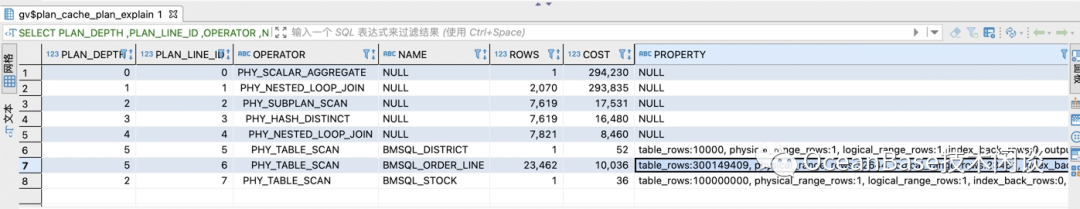 SELECT PLAN_DEPTH ,PLAN_LINE_ID ,OPERATOR ,NAME,ROWS,COST,PROPERTY FROM `gv$plan_cache_plan_explain` WHERE tenant_id=1001 AND ip = '172.30.118.70' AND port=2882 AND plan_id=340985 order by PLAN_LINE_ID ;+------------+--------------+----------------------+------------+------+------+----------------------------------------------------------------------------------------------------------------------------+| PLAN_DEPTH | PLAN_LINE_ID | OPERATOR | NAME | ROWS | COST | PROPERTY |+------------+--------------+----------------------+------------+------+------+----------------------------------------------------------------------------------------------------------------------------+| 0 | 0 | PHY_DIRECT_RECEIVE | NULL | 1 | 52 | NULL || 1 | 1 | PHY_DIRECT_TRANSMIT | NULL | 1 | 52 | NULL || 2 | 2 | PHY_TABLE_SCAN | BMSQL_ITEM | 1 | 52 | table_rows:100000, physical_range_rows:1, logical_range_rows:1, index_back_rows:0, output_rows:1, est_method:local_storage |+------------+--------------+----------------------+------------+------+------+----------------------------------------------------------------------------------------------------------------------------+3 rows in set (0.01 sec)