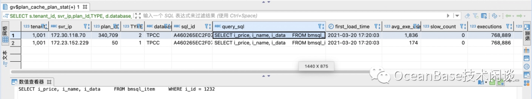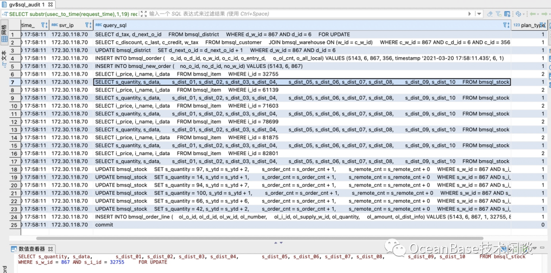 SELECT /*+ ob_querytimeout(100000000) */substr(usec_to_time(request_time),1,19) request_time_, s.svr_ip, s.query_sql, plan_type,TRANSACTION_HASH FROM gv$sql_audit sWHERE s.tenant_id=1001 and user_name='TPCC' -- and sid = 3222006308 and TRANSACTION_HASH ='6638448895855477417'ORDER BY REQUEST_ID LIMIT 100;