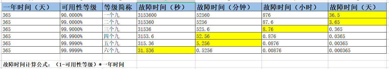 故障时间秒数=(1-可用性) * 365 * 24 * 3600