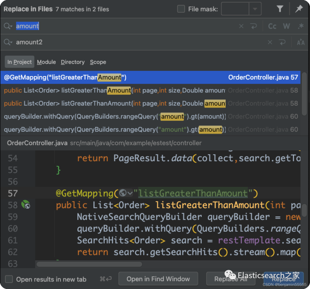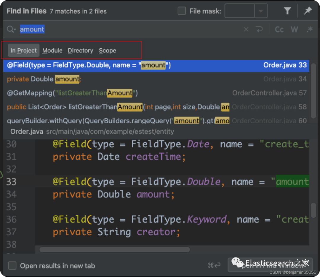 查询后可以列举出所有出现该关键字的地方,并且我们还可以设置查找范围,比如是全项目查找还是当前文件夹下查找