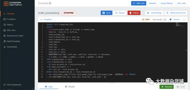 SSB 控制台显示查询示例。此查询执行 Kafka 主题与其自身的自联接,以查找来自地理上相距较远的相同用户的事务。它还将这种自连接的结果与存储在 Kudu 中的查找表连接起来,以使用来自客户帐户的详细信息来丰富流数据