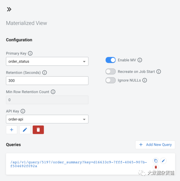在上一个订单汇总查询上定义一个物化视图,由 order_status 列键控。视图将为 order_status 的每个不同值保留最新的数据记录
