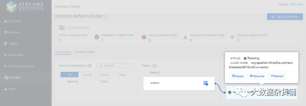 SMM 中的 Kafka Connect 监控页面显示所有正在运行的连接器的状态以及它们与 Kafka 主题的关联
