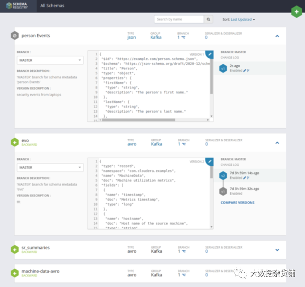 Schema Registry 提供了一个集中的存储库来存储和访问模式。应用程序可以访问模式注册表并查找他们需要用来序列化或反序列化事件的特定模式。Schema 可以在 Ether Avro 或 JSON 中创建,并根据需要进行演变,同时仍为客户端提供一种获取他们需要的特定模式并忽略其余部分的方法。