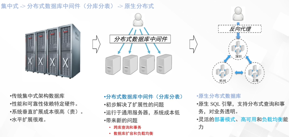 集中式->分布式数据库中间件(分库分表)->原生分布式