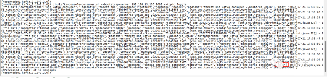 更多采集配置请详见:https://loggie-io.github.io/docs/reference/下的source节点。5)配置完成后查看测试pod所在节点(dev模式下日志只会采集到同一节点的loggie),kubectl get pods -l app=asdf -o wide ,查看loggie日志和kafka消费可以看到有数据,其中body字段为日志信息,日志采集成功。
