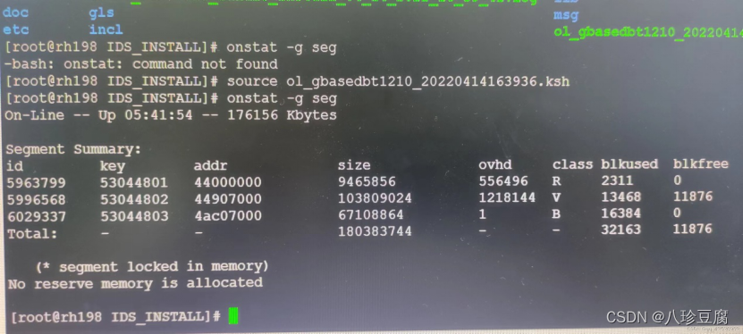 在IDS数据库系统中,使用onstat -g seg命令展示了共享内存段的以下内容: