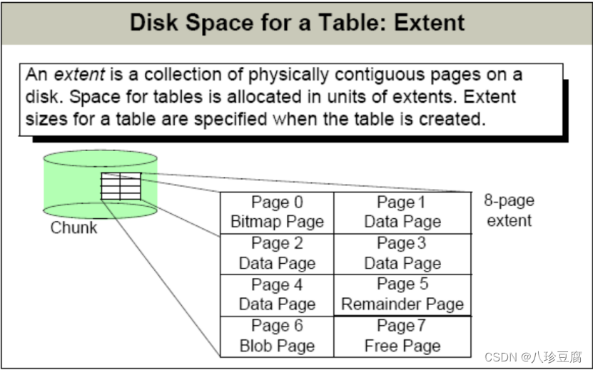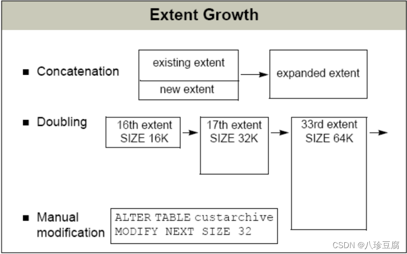 chunk 中多个连续的物理页组成一个 extent,每个表由多个 extent 组成。可 在建表时指定初始 extent 大小,默认大小为 8 页。表中现有 extent 填满后,自动 扩展 extent,下图说明了 extent 的扩展规则。