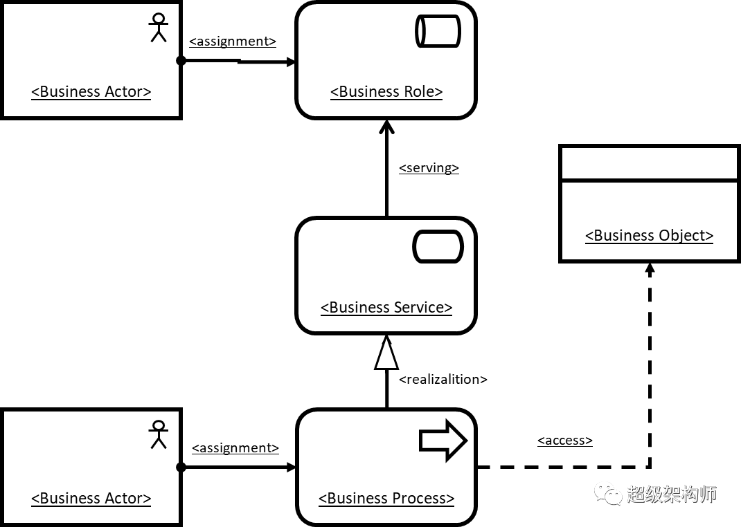 另一种方法是仅使用标准连接器并更改形状的轮廓以匹配所需的箭头和可能的线条中的破折号。对于专业化、实现和聚合箭头,您需要使用复制粘贴添加自定义箭头。在此阶段,您还希望使用对您的组织有意义的解释来标记连接器。在实践中,很多人只使用普通的箭头连接器,只使用标签。