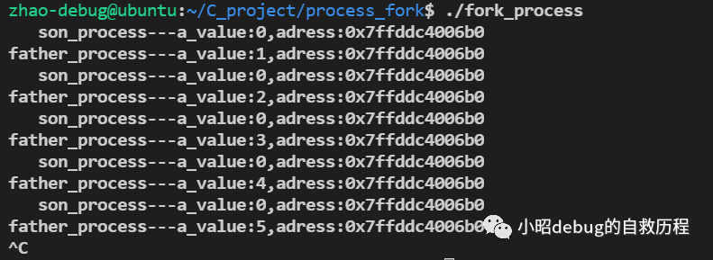 /*ubuntu下环境,gcc编译*/#include <stdio.h>#include <stdlib.h>#include <unistd.h>int main(int argc,char* argv[]){pid_t pid;int a_value=0;/*创建子进程*/pid = fork();if(pid == -1){perror("fork_error!\r\n");}if(pid > 0){/*父进程执行*/a_value=1;while(1){printf("father_process---a_value:%d,adress:%p\r\n",a_value,&a_value);sleep(1);//引起进程间调度a_value++;}}else if(pid == 0){/*子进程执行*/while(1){printf(" son_process---a_value:%d,adress:%p\r\n",a_value,&a_value);sleep(1);//引起进程间调度}}return 0;}