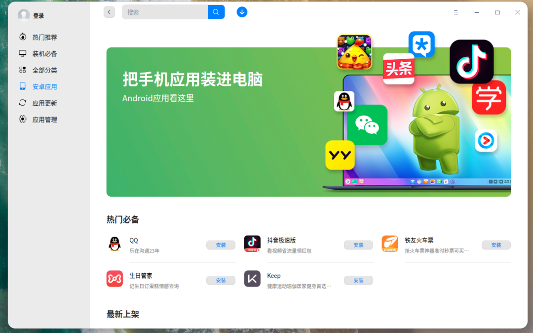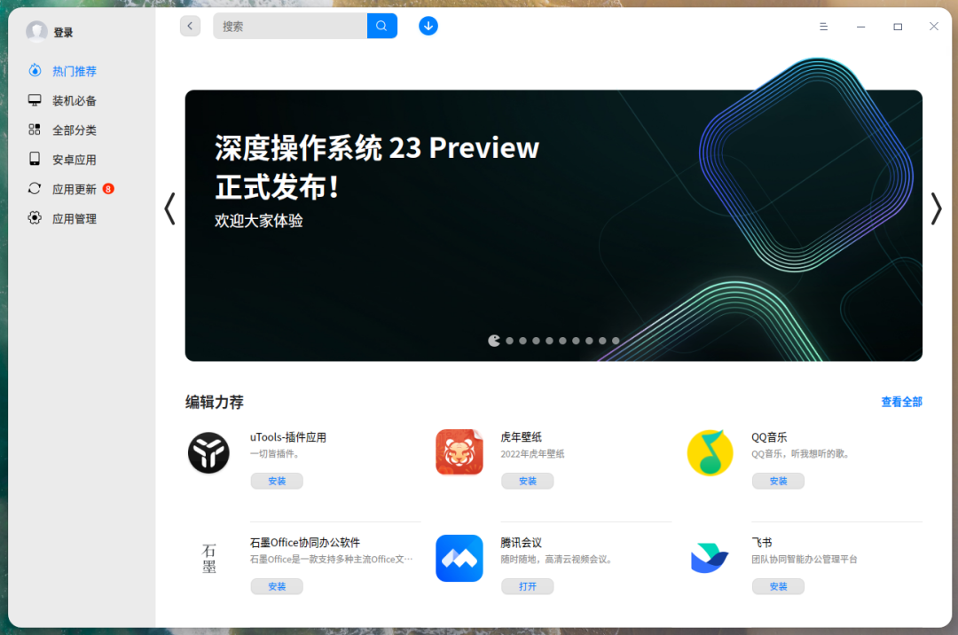 deepin自带一个应用商店,和现在手机系统自带的差不多。不全归不全,但常用的(微信,chrome,腾讯会议,wps)都有。