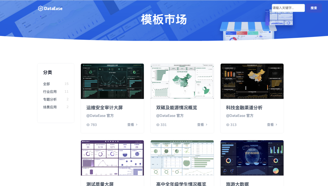 首先,进入DataEase模板市场主页,找到运维安全审计大屏。模板市场地址为:https://dataease.io/templates/。如需快速检索,可进行关键字搜索或分类切换,可以快速找到想要的大屏模板。