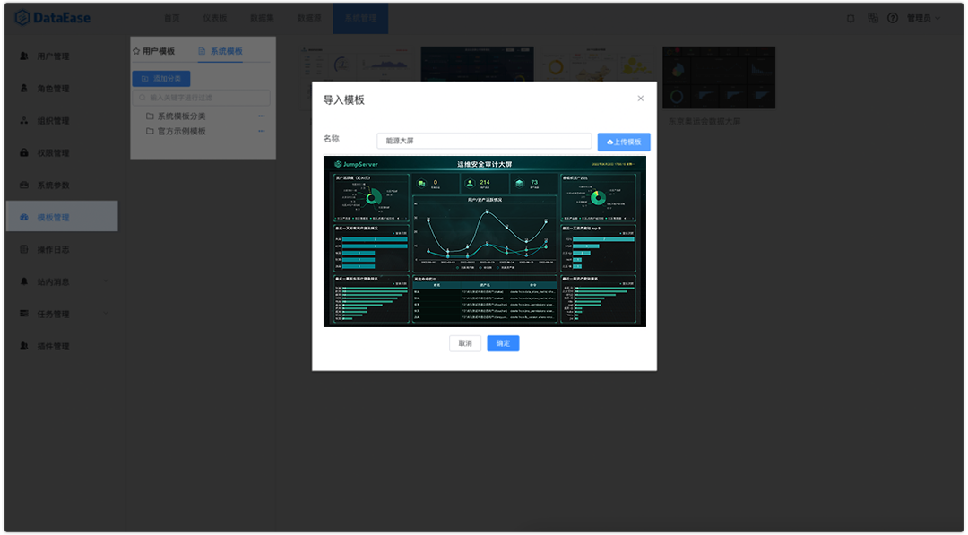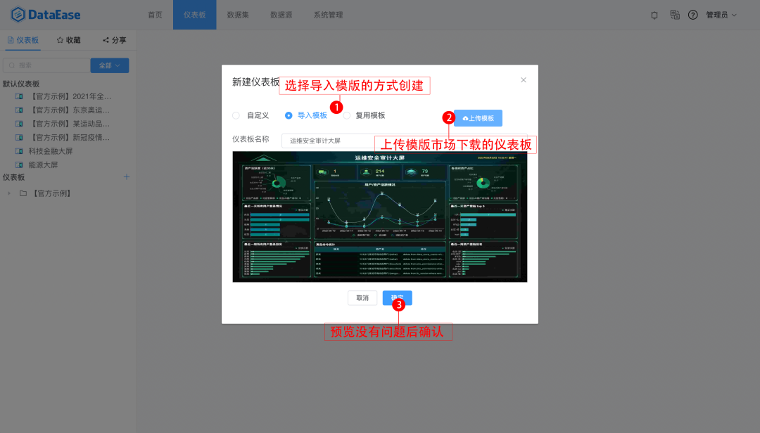 进入自己的DataEase系统的“仪表板”模块中,通过下图所示以“导入模板”的方式新建仪表板,点击“上传模版”按钮,选择使用“模版市场”下载的运维安全审计大屏的模版文件。