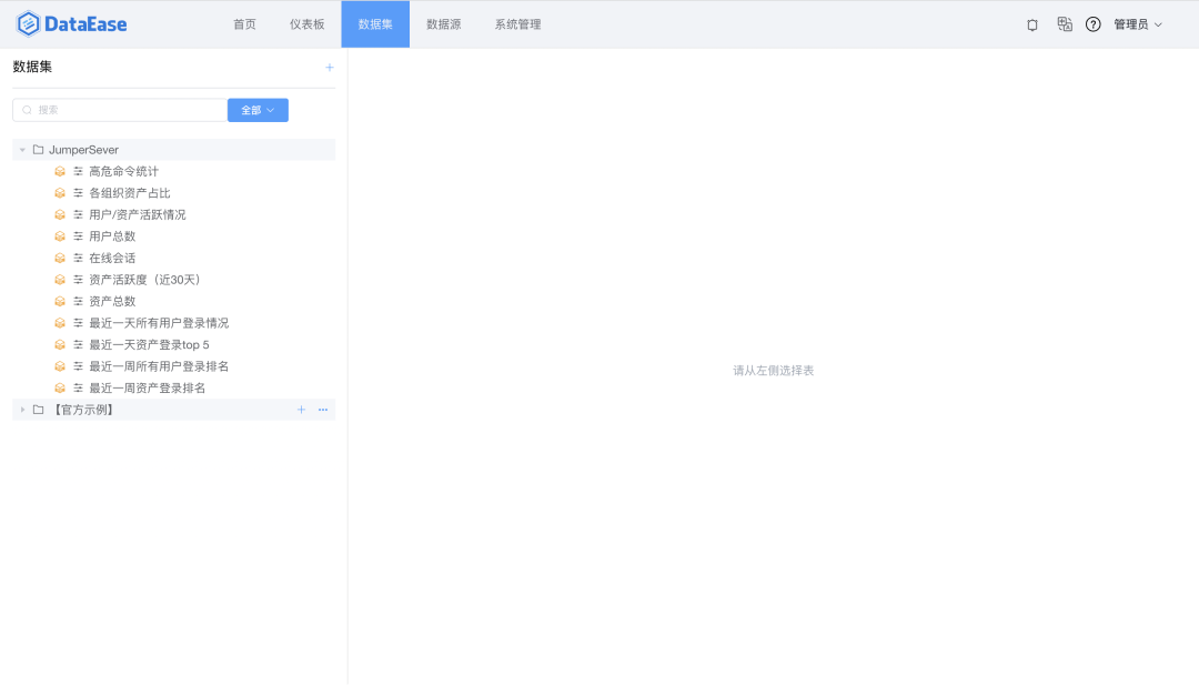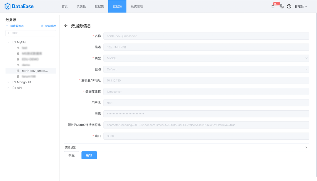 DataEase支持多种数据库作为数据源,JumpServer使用的是MySQL数据库,这里输入相应信息,创建数据源。