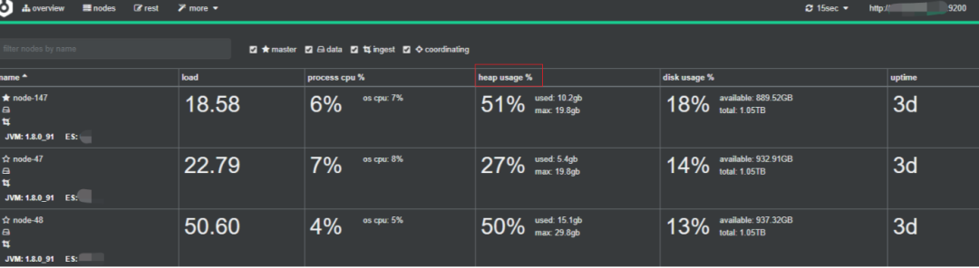文档增、删、改、查操作和搜索操作占用大量CPU和IO,因此监视数据节点利用率指标很重要。