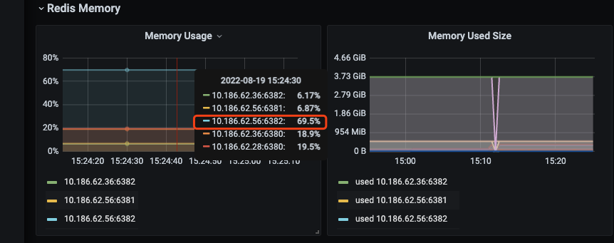 问题发生背景为某生产 Redis 集群(版本 Redis 5.0.10 ,架构为 30 片以上),该集群中某一个分片内存使用率异常高(内存占用达70%以上,其它片内存相对使用较低),我们模拟生产环境如下监控图所示: