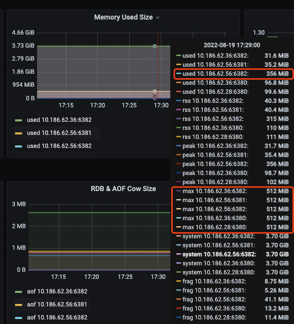 查看内存使用分布发现,该异常分片实例内存 Redis 使用为356M左右,单个 redis 最大可用内存512M 其它正常分片 redis 内存使用为100M 以内