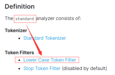 如下的两张图很直观的说明了:标准分词器的 Token filters 核心组成是:Lower Case Token Filter。