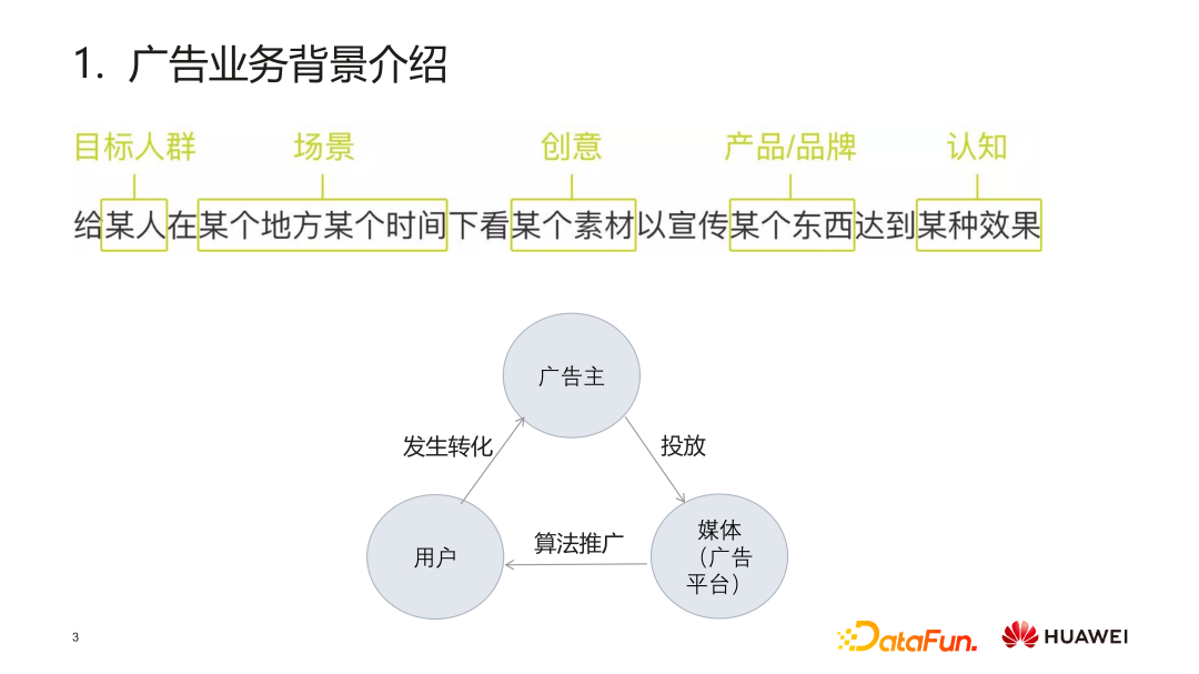 广告主在广告平台上投放广告任务,广告平台通过背后的大数据以及深度模型深度网络去进行算法推荐,将合适的广告推送给合适的用户,用户看了广告之后会发生转化,最终为广告主带来商业价值。一句话来说就是给某个人在某个时间某个地方去看某个素材,用以宣传某个东西,最终达到某种效果。