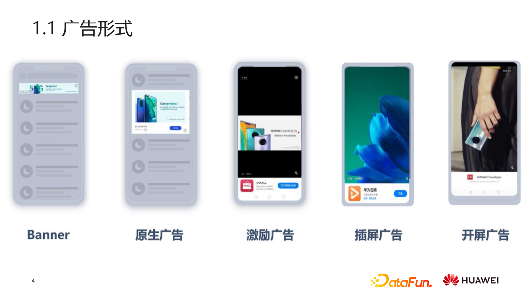 华为Ads支持多种广告形式,比如Banner广告、原生广告,激励视频广告、插屏广告以及开屏广告。同一个广告形式可以在不同的媒体上面进行展示,同一个媒体也支持各种广告形式的播放。