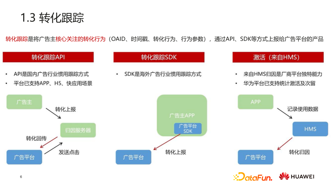 目前国内的广告行业惯用方式是API。平台已经支持 APP、H5、快应用等场景。SDK主要是在海外广告行业使用的跟踪方式,还有一种跟踪方式来自于HMS Core。HMS Core是华为的独特能力,目前华为平台已经支持统计激活和次留场景。通过转化跟踪,将广告主的转化数据上报给广告平台。